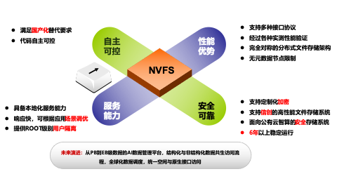 | 主要卖点 | 1.高性价比、灵活业务适配 2.自主可控,信创适配,数据安全性高 3.调度平台定制化服务开发 | 1.快速一体化交付,开箱即用 2.易运维,整机服务、性能极致优化 3.继承软件全部功能特性 | 1.支持双控双通数据盘访问读写 2.单节点读带宽 200GB/s 、4K读500万 IOPS极致性能 | |